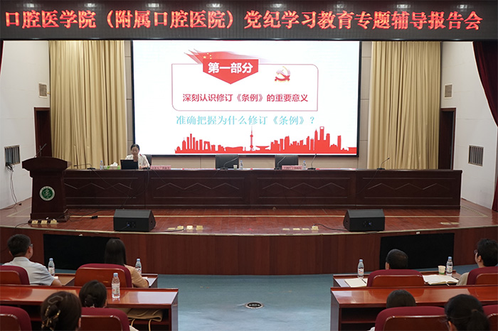 黄新美强调,纪律是管党治党的“戒尺”,抓好《条例》的贯彻执行,要在服务党和国家大局中学习领会《条例》的主旨要义,增强遵规守纪自觉,同时敢于善于斗争,严格精准执纪。口腔医学院(附属口腔医院)各级党组织和领导班子要进一步深化对加强党的纪律建设的重要性认识,切实扛起全面从严治党的政治责任,以正在开展的党纪学习教育为契机,持续教育引导广大党员教职医护员工学纪、知纪、明纪、守纪,真正使学习党纪的过程成为增强纪律意识、提高党性修养、砥砺实干担当的过程。