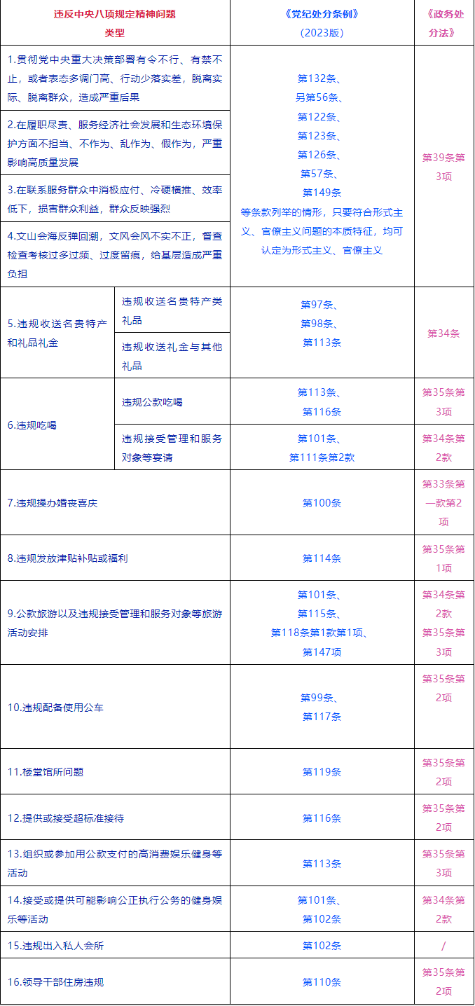 对违反中央八项规定精神问题的行为,并不是直接依据中央八项规定作出定性处理,除《党纪处分条例》第一百三十二条列举的形式主义、官僚主义情形外,其他适用《党纪处分条例》分则对应的具体条款进行处分。